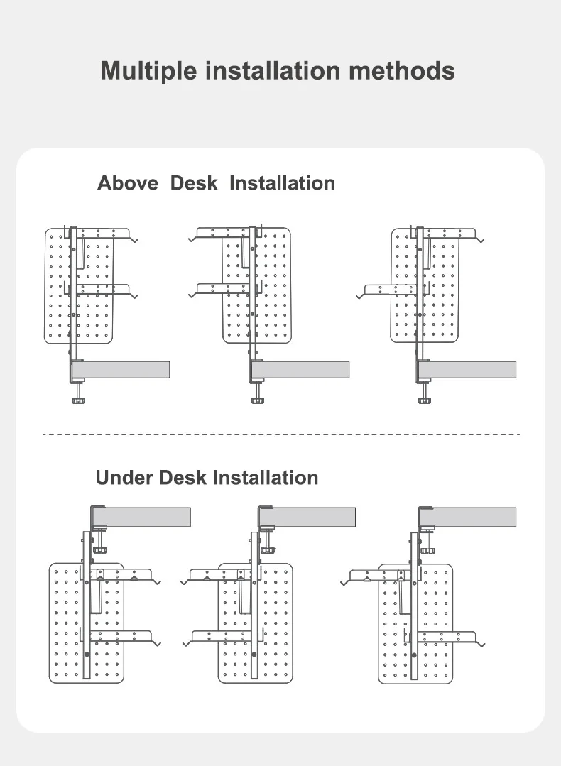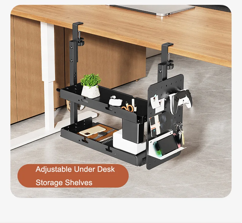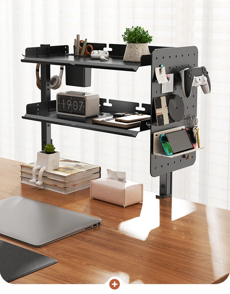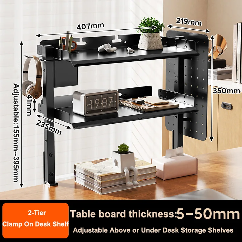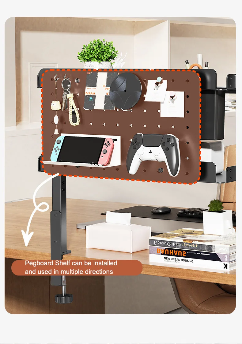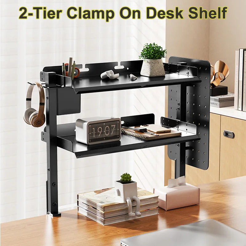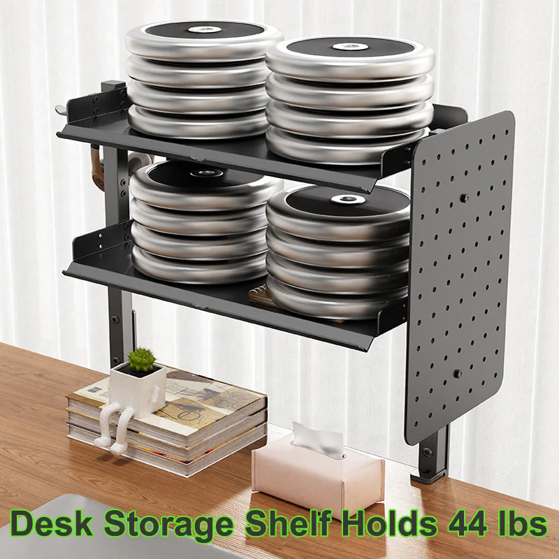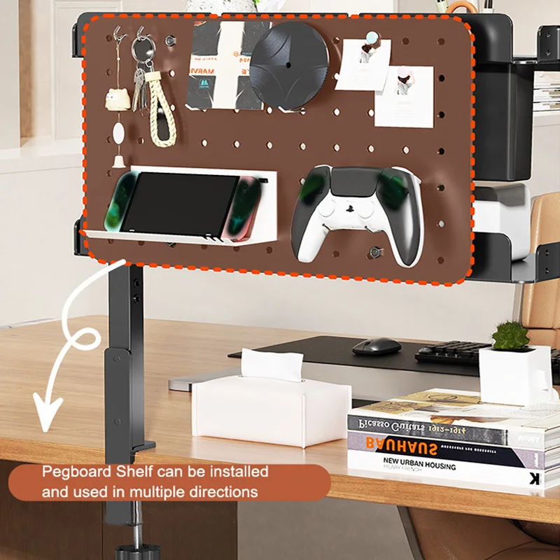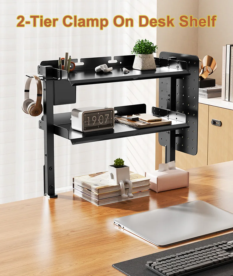 Clamp On Desk Pegboard with 16 inches Organizer Shelf, Adjustable Above or Under Desk Storage Shelf Holds 44 lbs, Magnetic Metal Peg Board for Office and Gaming Accessories